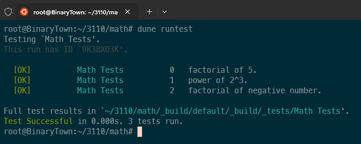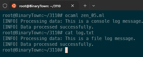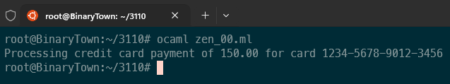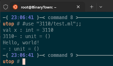 - #use "filename.ml";; : Belirtilen dosyayı yükler ve içindeki kodu çalıştırır. Dosya uzantısı .ml olmalıdır. Örneğin aşağıdaki içeriğe sahip bir ml dosyamız olduğunu düşünelim. (Clarkson'un öğretisine bağlı kalarak WSL ortamında 3110 isimli bir klasör oluşturup içine bu dosyayı koydum)
