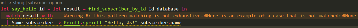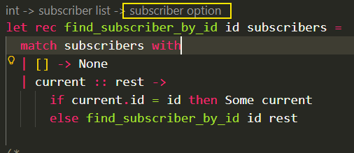 Rust tarafından buraya geçmek gerçekten çok enteresan bir deneyim. Zira yıllardır Rust dilinde Option, Result gibi önemli veri yapılarını hangi felsefeden geldiğini çok da anlamadan kullanmışım. Pişmanım :D Neyse neyse... Kodda bir abone listesinden id bazlı kullanıcı araması yaptığımız recursive bir fonksiyon bulunuyor. Kodun sentaksına bakarken çok fazla bir şey anlamayabiliriz ama VS Code ya da Utop fonksiyon imzasında option döndüğünü açıkça ilan eder.