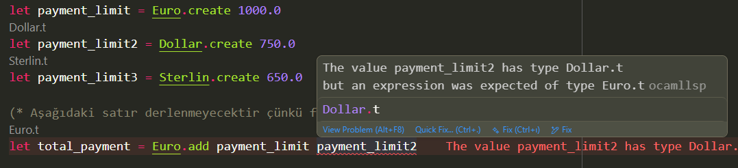 Bu tip sistemi aklımızın bir köşesinde dursun ve gelin bir örnekle konuyu pekiştirmeye çalışalım. Finansal operasyonların her adımı son derece kritiktir. Büyük bir finans sisteminde farklı türden para birimlerinin olması da kesindir. Örneğin Dolar, Sterlin, Euro gibi para birimlerini göz önüne alalım. Tümü float türünden olsalar da bunları birbiriyle yanlışlıkla toplamak faciaya neden olabilir. 1000 Dolar ile 1000 Euro'nun toplanabildiğini düşünün, korkunç... OCaml ile bu sorunu nasıl aşabiliriz gelin örnek kod parçası ile bakalım.