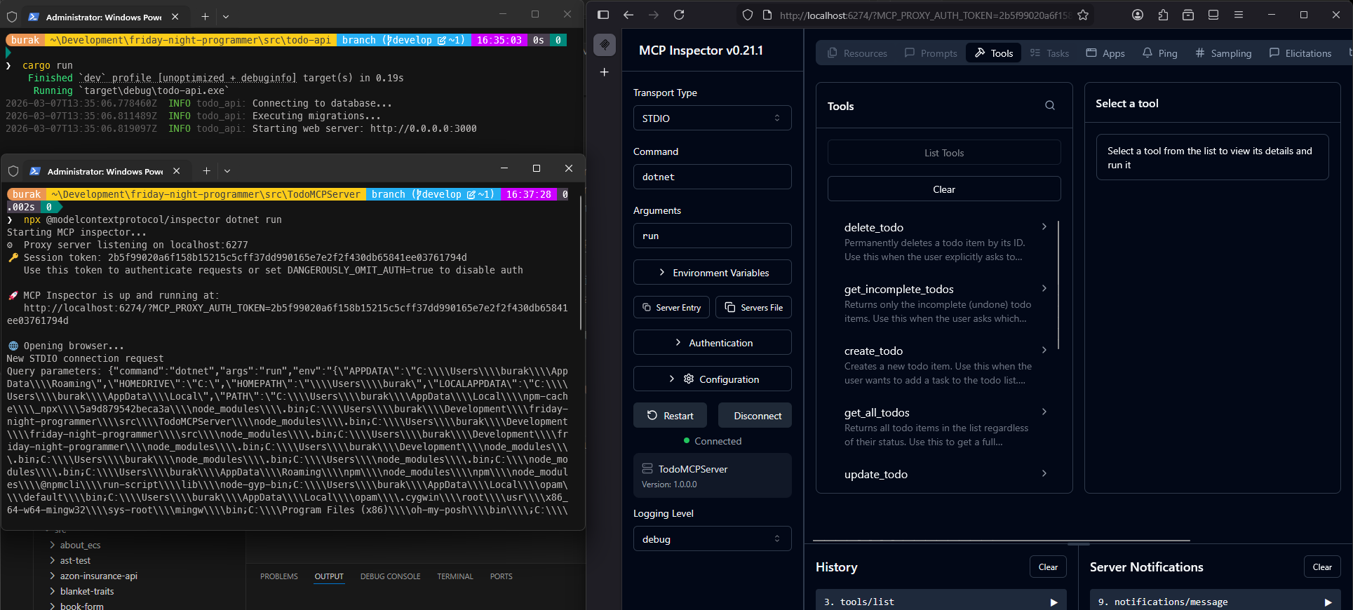 Bu işlemin ardından VS Code Extension kısmında todo mcp server isimli sunucu otomatik olarak görünecektir. Extension arabiriminden MCP sunucusunu başlatabiliriz ama pek tabii öncesinde todo-api isimli api servisinin de çalıştırılması gerektiğini hatırlatalım :D Sonuçta kendi sistemimde aşağıdaki ekran görüntüsünde yer alan sonuçlara ulaştım.