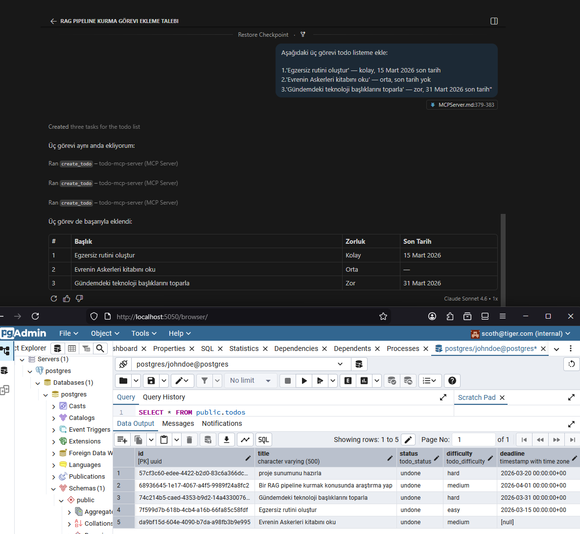 Gelelim ana mevzuya. Derme çatma da olsa todo listesini yönetebildiğimiz basit bir rest servisi bulunuyor. Bu servis en azından yukarıdaki senaryoda belirtilen işlevleri sağlamakta(Gerçek bir saha kurgusunu hazırlarken ilk olarak soruları ve görevleri içerecek bir metin çalışması yapmak, mcp araç setinden sunulacak fonksiyonellikleri doğru şekilde tasarlamak adına önemli olacaktır)