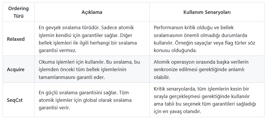 Lakin burada özellikle dikkat edilmesi gereken nokta Ordering parametresine verilen değerle ilgilidir. Bu parametreler, atomik işlemlerin bellek sıralaması üzerindeki etkilerini belirler. Yukarıdaki örnekte Relaxed sıralama kullanılmıştır ki bu en gevşek sıralamadır ve en yüksek performansı sağlar. Ancak bazı senaryolarda daha güçlü sıralama garantilerine ihtiyaç duyulabilir. Bu durumda Acquire, Release veya SeqCst gibi farklı sıralama türleri tercih edilmelidir. Karar vermek zor olabilir bu yüzden aşağıdaki tabloyu incelemek faydalı var.