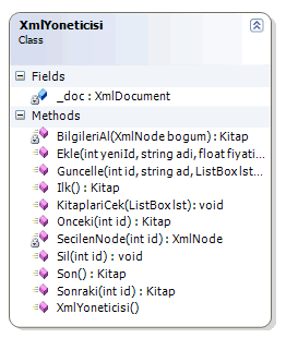 Şimdi gelelim daha önemli olan kısımlara. Özellikle Xml üzerinde yapacağımız genel işlevsellikleri taşıyacak ayrı bir tip tasarlayacağız. XmlYoneticisi isimli tipimiz genel olarak, Xml ağacı üzerinde navigasyon, Xml içeriğini liste kutusuna aktarma, Xml boğumu güncelleme, silme ve ekleme gibi işlevsellikleri bünyesinde barındırmaktadır. Elbette bunların işlenmesi sırasında ele alınacak bazı yardımcı fonksiyonellikler de yer almaktadır. XmlYoneticisi isimli sınıfımızın şeması ve kodları aşağıdaki gibidir.