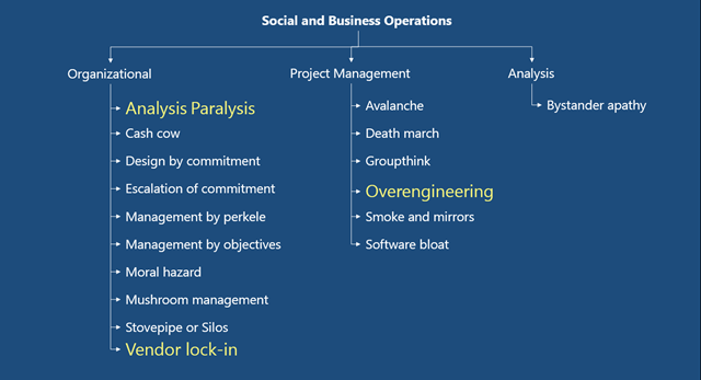 Ben sunum için Wikipedia tarafında yayınlanan AntiPatterns maddelerini ele almaya çalıştım ve onları aşağıdaki gibi daha anlaşılır bir grafik haline getirdim. (Sarı punto ile işaretlenen başlıklar, sunumlarda vakit yettiği ölçüde ele almak istediğim konulardı)