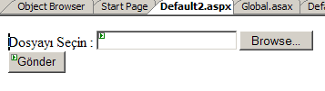 Upload işlemlerini kolaylaştırmak adına Asp.Net 2.0, FileUpload isimli bir kontrol getirmektedir. Bu kontrol basit olarak istemcinin Upload etmek istediği dosyayı seçebilmesini sağlamaktadır. Bu seçim işlemi ile birlikte, sunucuya gönderilmek istenen dosyaya ait bir takım bilgilerde FileUpload kontrolünce elde edilir. Örneğin içeriğin tipi kontrol edilerek sadece bazı dosyaların gönderilmesine izin verilebilir. İlk olarak web uygulamamıza aşağıdaki gibi Default2.aspx sayfasını ekleyelim.