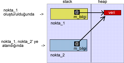 Normal şartlar altında nokta_1 isimli yapı örneğini nokta_2 isimli yapıya aktardığımızda bellek üzerinde iki farklı değişken alanı oluşturulacaktır. Dolayısıyla nokta_2 isimli nesne örneği üzerinden X ve Y alanları için yaptığımız değişiklikerin nokta_1 nesne örneğini etkilemeyeceği ortadadır. Ancak aynı davranış biçimi, içeride kullandığımız NoktaBilgisi tipi için geçerli olmamıştır. Bu durumu aşağıdaki grafik ile daha net canlandırabiliriz.