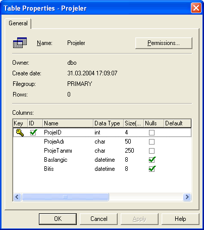 Şekil 3. Projelere ait yüzeysel bilgileri tutacak olan Projeler tablosu.