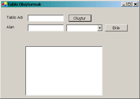 Şimdi ise tablomuza nasıl field(alan) ekleyeceğimize bakalım. Önceden bahsettiğimiz gibi tablonun alanları aslında DataTable sınıfının Columns koleksiyonuna ait birer DataColumn nesnesidir. Dolayısıyla öncelikle bir DataRow nesnesi oluşturup bu nesneyi ilgili DataTable’ın Columns koleksiyonuna eklememiz gerekmektedir. Alanın ismi dışında tabiki veri türünüde belirtmeliyiz. Bu veri türlerini belirtirken Type.GetType syntaxı kullanılır. Formumuzu biraz değiştirelim. Kullanıcı belirlediği isimde ve türdeki alanı, tabloya ekleyebilecek olsun. Söylemek isterimki bu uygulamada hiç bir kontrol mekanizması uygulanmamış ve hataların önünce geçilmeye çalışılmamıştır. Nitekim amacımız DataTable ile bir tablonun nasıl oluşturulacağına dair basit bir örnek vermektir. Formumuzu aşağıdaki gibi değiştirelim. Kullanıcı bir tablo adı girip oluşturduktan sonra istediği alanları ekleyecek ve bu bilgiler listbox nesnemizde kullanıcıya ayrıca gösterilecek.