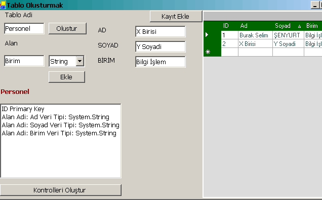 Şimdi programımızı deneyelim. Ben örnek olarak Ad ,Soyad ve Birim alanlarından oluşan bir tablo oluşturdum ve iki kayıt girdi. İşte sonuç,