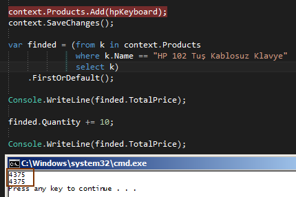 Senaryoda ürün eklendikten sonraki durumda Calculated Field alanının hesaplanarak geldiği görülmektedir. Yani ilk eklemeden sonra gerçekleştirilen LINQ ifadesine göre TotalPrice için SQL tarafındaki hesaplama devreye girmiştir. Ancak bellek üzerinde kalan Product nesne örneğinin Quantity veya ListPrice alanlarında bir değişiklik yapıldığında, bu çok doğal olarak TotalPrice' a yansımayacaktır.