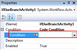Makalemize IfElseBranchActivity bileşenlerinde Condition özelliğinde Code Condition seçeneğini nasıl kullanacağımızı inceleyerek devam edelim. Bu amaçla örnek olarak herhangibir IfElseBranchActivity' nin Condition özelliğine Code Condition değerini atmamız yeterli olacaktır.