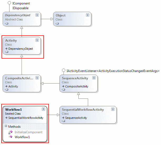 Proje içerisine varsayılan olarak atılan Workflow1 isimli sınıfın(Class) hiyerarşik yapısı ise aşağıdaki sınıf diyagramında(Class Diagram) olduğu gibidir.