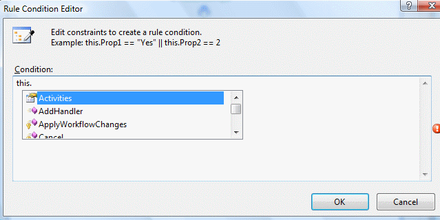 Artık tasarım tarafına dönülerek ilk IfElseBranchActivity için gerekli koşul aşağıdaki ekran görüntüsündeki gibi oluşturulabilir.