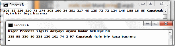 Nesne örneklemesini takiben yine bir MemoryMappedViewAccessor oluşturulmaktadır. Bu kez farklı bir blok ele alınmakta ve yine içeriğinin ilk 10 byte’ lık bölümü ekrana yazdırılmaktadır. Önce ProgramB ardından ProgramA çalıştırılacak şekilde Solution ayarlanırsa aşağıdaki çalışma zamanı görüntüsü elde edilecektir