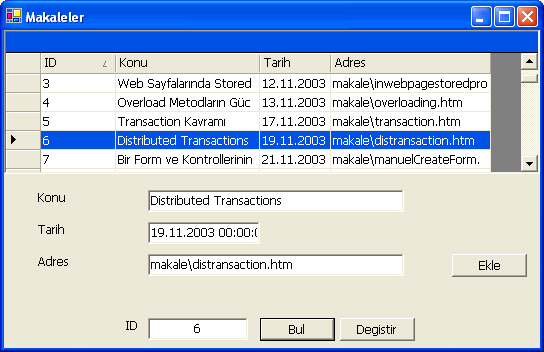 Bir önceki makalemizde, Kuvvetle Türlendirilmiş Veri Kümelerinin ne olduğunu ve nasıl oluşturulduğunu incelemiştik. Bu makalemizde ise, bir türlendirilmiş veri kümesi yardımıyla satır ekleme, arama, düzenleme ve silme gibi işlemlerin nasıl yapılacağını inceleyeceğiz. Bu amaçla işe basit bir windows uygulaması ile başlıyoruz. Bu uygulamamızda kolaylık olması açısından Kuvvetle Türlendirilmiş Veri Kümemizi, Visual Studio.NET ortamında oluşturdum. Uygulamamızda, Makale isimli sql tablomuzu kullanacağız. Uygulamamızın formu izleyen şekildeki gibi olucak.