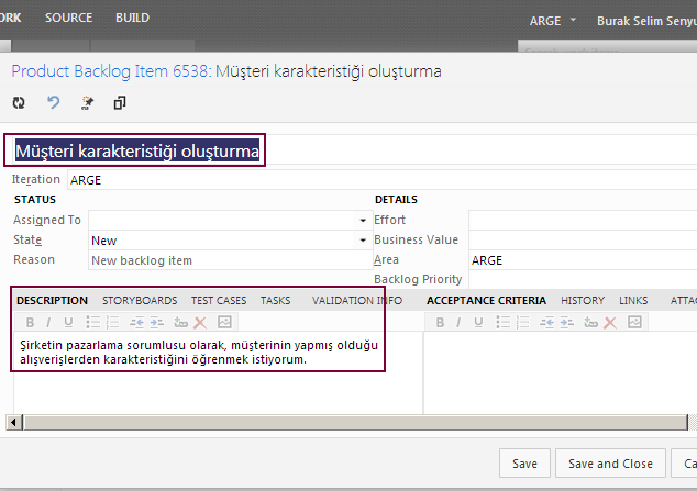 Şu aşamda Save işlemini icra ettiğimizde TFS tarafında aşağıdaki içeriklerin oluştuğuna şahit olabiliriz. Dikkat edileceği üzere “Müşteri karakteristiği oluşturma” isimli bir Product Backlog Item oluşturulmuş ve varsayılan olarak o anki güncel Sprint’ e ilave edilmiştir.