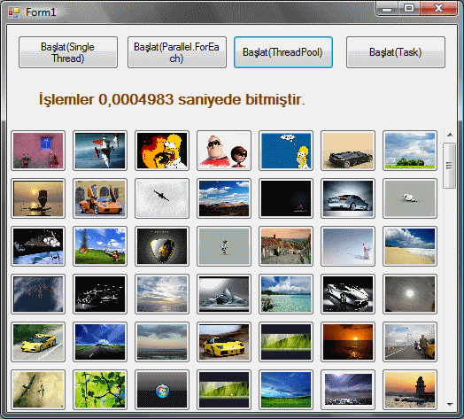 Evett...Durumu bir değerlendirelim. 20 saniyelik sürelerden yaklaşık 8 saniyelik sürelere indik. Bu çift çekirdekli bir sistem için iyi bir sonuç olarak görünüyor. (Tabi kodu daha fazla çekirdek sayısı bir sistemde ne yazıkki test edemedim. Ama siz değerli okurlarımdan test etme fırsatı olan olursa sonuçları paylaşmasını rica edeceğim.) Yinede herşey istediğimiz gibi değildir. Süre azalmasına rağmen, Form' u işlemler sırasında harekete ettiremediğimizi görürüz. Benzer şekilde resimleri içeren Button kontrolleri yine üretildikçe değil tüm işlemler bittikten sonra bir anda ekranda gösterilmektedir. Dolayısıyla Parallel.ForEach' in tam anlamıyla yeterli gelmediğini söyleyebiliriz. Çözüm olarak ThreadPool sınıfından yararlanabiliriz aslında. Şimdi kodu aşağıdaki gibi değiştirdiğimizi düşünelim.