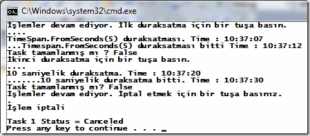 Tedbiri elden bırakmadık ve yine bir iptal işlemini işin içerisine kattık. Ancak odaklanacağımız nokta tabiki bu değil. Kodun iki farklı satırında Wait metodunun kullanıldığını görmekteyiz. İlk kullanımda o anki andan itibaren 5 saniyelik bir duraksatma gerçekleştiriyoruz. Diğer metod kullanımından ise 10000 mili saniyelik süre bildirimi yaparak 10 saniyelik bir duraksatma icra ettirmekteyiz. Wait metodu bool tipinden değer döndürmektedir. False değer dönmesi, ilgili Task bloğunun herhangibir sebepten işyelişini tamamlamamış olması veya iptal edilmesi anlamına gelmektedir. Tahmin edileceği üzere Task’ in başarılı bir şekilde tamamlanması sonucu bu değer True olacaktır. Örneğimizi çalıştırdığımızda, aşağıdaki ekran görüntüsündekine benzer sonuçlar ile karşılaşabiliriz.