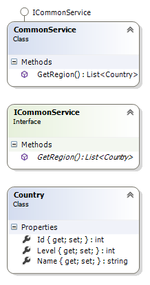 ICommonService isimli servis sözleşmesi(Service Contract) içerisinde yer alan GetRegion isimli fonksiyon, Country tipinden elemanlardan oluşan bir listeyi döndürmekte olan servis operasyonunu tanımlamaktadır. Country tipi ise basit bir POCO olup aşağıdaki içeriğe sahiptir.