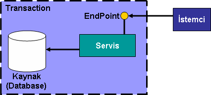 Burada bilinen Ado.Net Transaction tiplerinin kullanılması bile yeterlidir. Ne varki az önce bahsettiğimiz gibi servis yönelimli mimari aslında aşağıdaki şekildekine benzer bir durumuda içermektedir.
