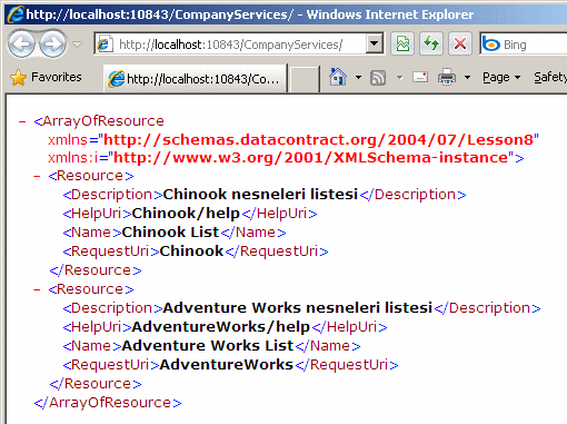 Buna göre örnek bir tarayıcı uygulama üzerinden http://localhost:10843/CompanyServices/ adresine yapacağımız bir talebin sonucu aşağıdaki gibi olacaktır.