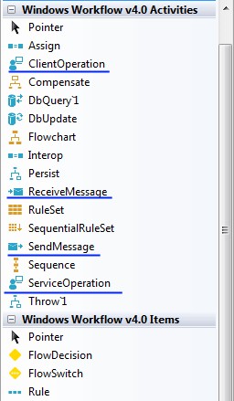 Görüldüğü üzere pek çok farklı aktivite tipi yer almakta. Bu şekilde altı mavi çizgi ile işaretlenmiş olan aktiviteler(veya Workflow elementleri) WCF odaklı bileşenlerdir. Örneğin ClientOperation bileşeni ile, bir WCF operasyonunu SendMessage/ReceiveMessage yapısına uygun olacak şekilde çağırmak mümkün olmaktadır. ServiceOperation bileşeni ile WF içerisinden dışaryı bir WCF operasyonu(Operation) yine SendMessage/ReceiveMessage yapısına uygun olaraktan sunulabilmektedir. SendMessage aynen 3.5' teki SendActivity aktivitesine benzer olacak şekilde tek yönlü mesaj(One Way Message) gönderilmesinde kullanılır. Tahmin edileceği üzere ReceiveMessage bileşenide tek yönlü olaraktan WCF mesajlarının alınmasında kullanılmaktadır.