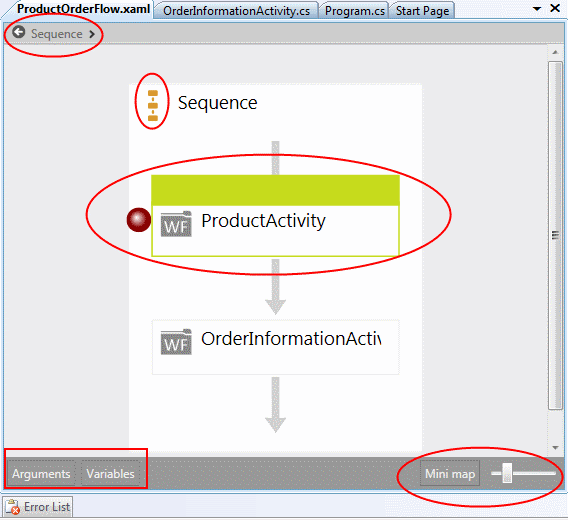 Dikkat çekici noktalardan bir diğeride örnekte yer alan ProductActivity bileşeni yanında bir Breakpoint yer almasıdır. Dolayısıyla debug işlemleri için Workflow elementlerinin kendisinin designer içerisinde doğrudan işaretlenebildiğini söyleyebiliriz. Diğer dikkat çekici kısımda sol alt tarafta yer alan Arguments ve Variables bölümleridir. Bugün yazımızda Variables kısmını kullanarak Sequence aktivitesinin tamamını ilgilendiren değişkenlerin nasıl tanımlanabileceğini ve kullanılabileceğinide görmüş olacağız. Önemli noktalarda biriside Arguments veya Variables gibi bölümler ile Workflow içerisinde çeşitli tanımlamaların koda girmeye gerek duymadan kolay bir şekilde görsel olarak yapılabilmesidir. (Designer tarafının kullanımını daha kolay kavramak için yayınlanacak görsel derslerimizi takip etmenizi öneririm.)
