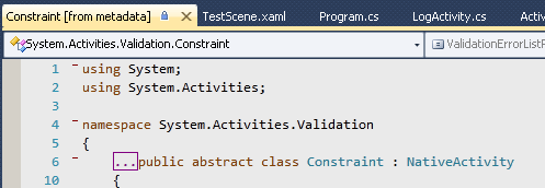 Yukarıdaki şekildende görülebileceği gibi Constraint abstract bir sınıftır(dolayısıyla kendisinden türeyen tiplerin mutlaka uyması gereken kuralları bildiren, örneklenemeyen ama kendisinden türeyen tip örneklerini taşıyabilen bir sınıftır) ve NaticeActivity tipinden türemektedir. Bu türetme nedeniyle aslında Workflow çalışma zamanının çeşitli materyallerine erişebildiğini(Scheduling, Bookmarks vb...) söyleyebiliriz. Peki pratikte kendi geliştireceğimiz aktivite bileşenleri için gerekli kısıtları nasıl koyabiliriz? MSDN üzerinde bu konu ile ilişkili olarak geliştirilen basit örnekte bir aktivite bileşeninin DisplayName özelliğinin 2 karakterden fazla olması gerekliliğinin örneklendiği görülmektedir. Bizde buna benzer bir kısıtlama geliştiriyor olacağız. Ancak örneğin farklı olması açısından, hayali yazılım şirketinin kod standartlarına göre DisplayName özelliğinin Chinook ön eki ile başlaması için bir kısıt getireceğiz. İşte Activity Library içerisinde tuttuğumuz örnek sınıf kodlarımız.