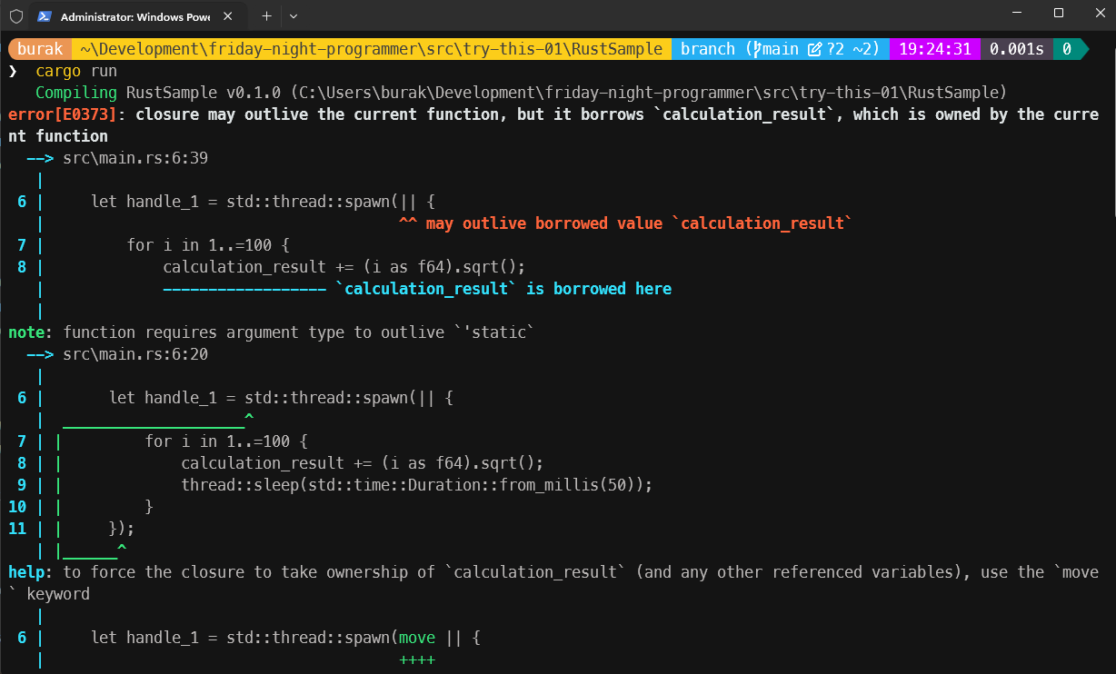 Yazım stili farklılaşsa da benzer bir işleyiş olduğunu söyleyebilirim. handle_1 ve handle_2 isimliye yumurtlanan thread'ler ortak değişken olan calculation_result üzerinde yazma işlemi yapıyor. Ne varki bu kodu çalıştıramayacağız zira derleyici bizi aşağıdaki ekran görüntüsünde olduğu gibi üzecek.