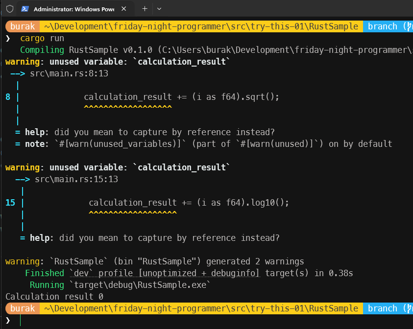 Bu sefer program sorunsuz şekilde çalışacaktır ancak sonuçlar hiç de beklediğimiz gibi olmayacaktır. Programı kaç kez çalıştırırsak çalıştıralım her seferinde 0(yazıyla sıfır) sonucunu elde ederiz :D Üstelik Rust derleyicisi calculation_result değişkeninin hiç kullanılmadığını bile iddia eder.
