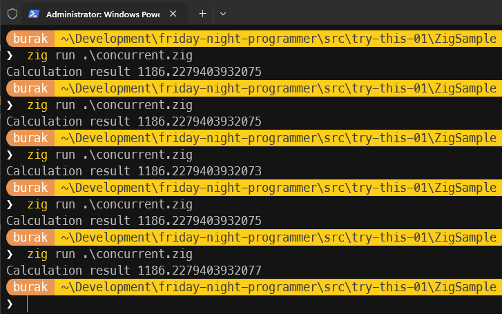 Hatırlarsanız Rust tarafındaki kilitleme örneğinde de benzer bir durum söz konusuydu. Küsüratlarda ara sıra sapmalar yaşanmakta. Ancak genel olarak Zig tarafındaki sonuçların Rust tarafındaki sonuçlara daha yakın olduğunu söyleyebilirim. Yine de her iki dilde de thread'lerin çalışma zamanlarındaki farklılıklardan ötürü tam olarak aynı sonuçları elde etmek mümkün olmayabilir.