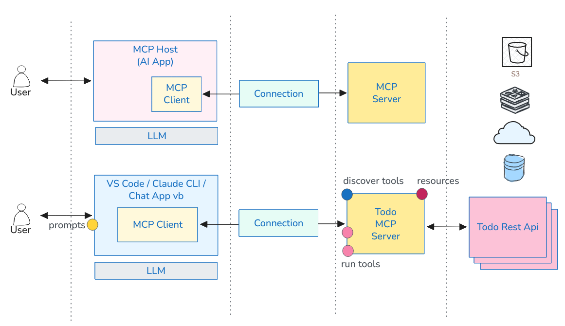 Kobay olarak bir todo listesi ile ilintili API servisi kullanan ilkel bir MCP sunucusu yazıp kullanmayı deneyeceğiz. Todo listemizi postgresql veritabanı üzerinde bir tabloda tutabiliriz. Pahalı oldu ama işe yarar :D Normalde bu veri setinden sorgulama yapmak veya yeni bir todo eklemek, durum güncellemek ya da silmek için standart bir yol izleriz. Kullanıcı dostu bir önyüz uygulaması, onun çağırdığı ve bu bahsedilen hizmetleri yerine getiren kuvvetle muhtemel bir rest servisi. Amacımız bir MCP sunucusu yazıp nasıl kullanıldığını deneyimlemek olduğundan todo listesinin ele alındığı projenin çapı şu an için çok da önemli değil. Ancak aşağıdakilere benzer işleri icra edeceğimiz bir senaryo kurgulamak pekala mümkün.
