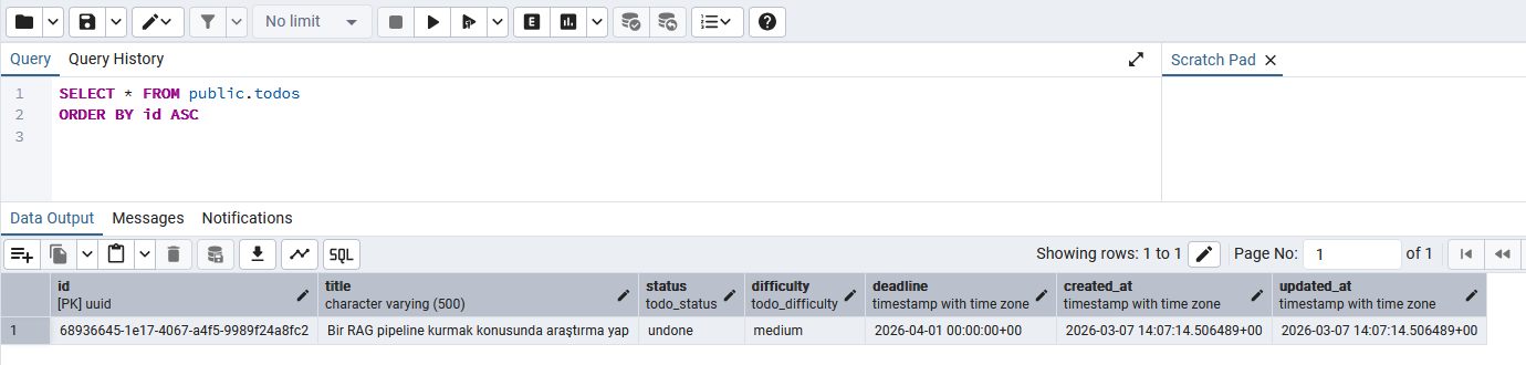 Tabii hemen pgadmin arabirimi üzerinde tabloyu sorgulamak istedim.