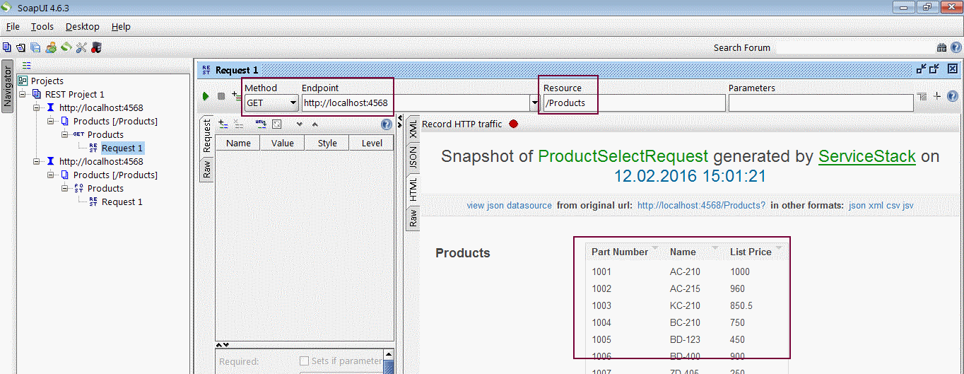 ServiceStack istemci tarafına özel bir HTML içeriği basar. İstenirse çıktılar json,xml,csv ve hatta jsv formatında alınabilir. Tek yapılması gereken URL sonuna ?format=json benzeri bir ifade eklemektir. Örneğin ürün adı B harfi ile başlayanların listesini JSON formatında elde etmek istersek http://localhost:4568/Products/B?format=json şeklinde bir talep gönderilmesi yeterlidir.