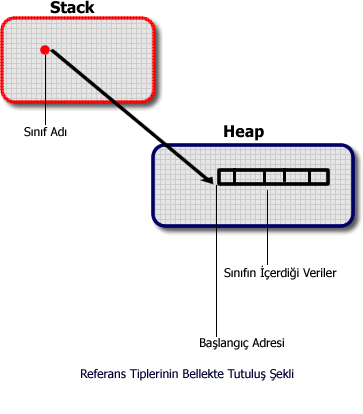 Herşeyden önce en önemli fark, yapıların değer türü olması ve sınıfların referans türü olmasıdır. Sınıflar referans türünden oldukları için, bellekte tutuluş biçimleri değer türlerine göre daha farklıdır. Referans tiplerinin sahip olduğu veriler belleğin öbek(heap) adı verilen tarafında tutulurken, referansın adı stack(yığın) da tutulur ve öbekteki verilerin bulunduğu adresi işaret eder. Ancak değer türleri belleğin stack denilen kısmında tutulurlar. Aşağıdaki şekil ile konuyu daha net canlandırabiliriz.